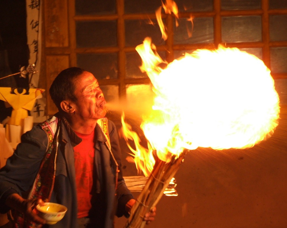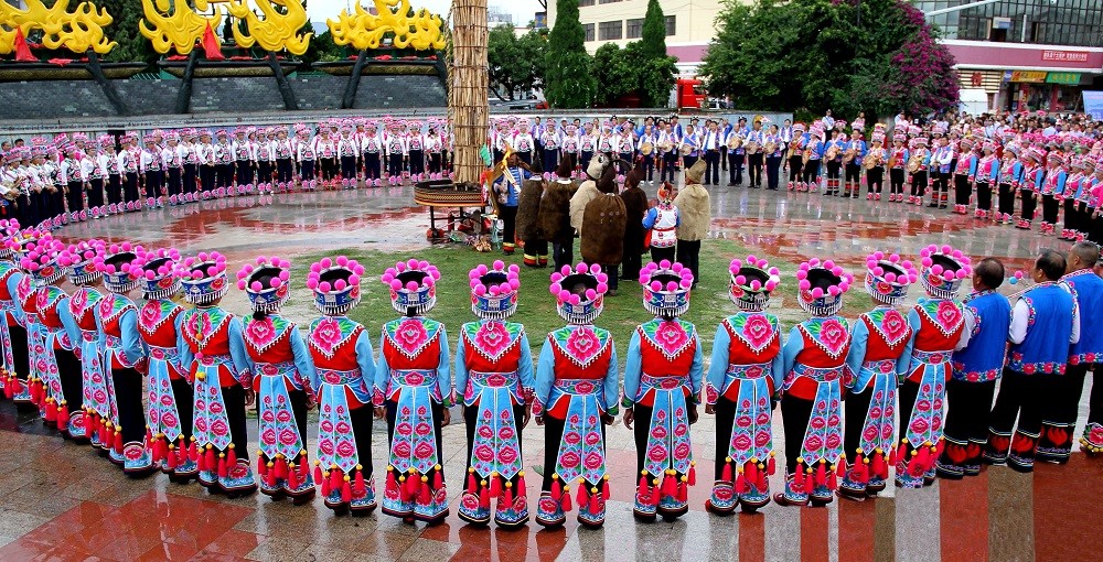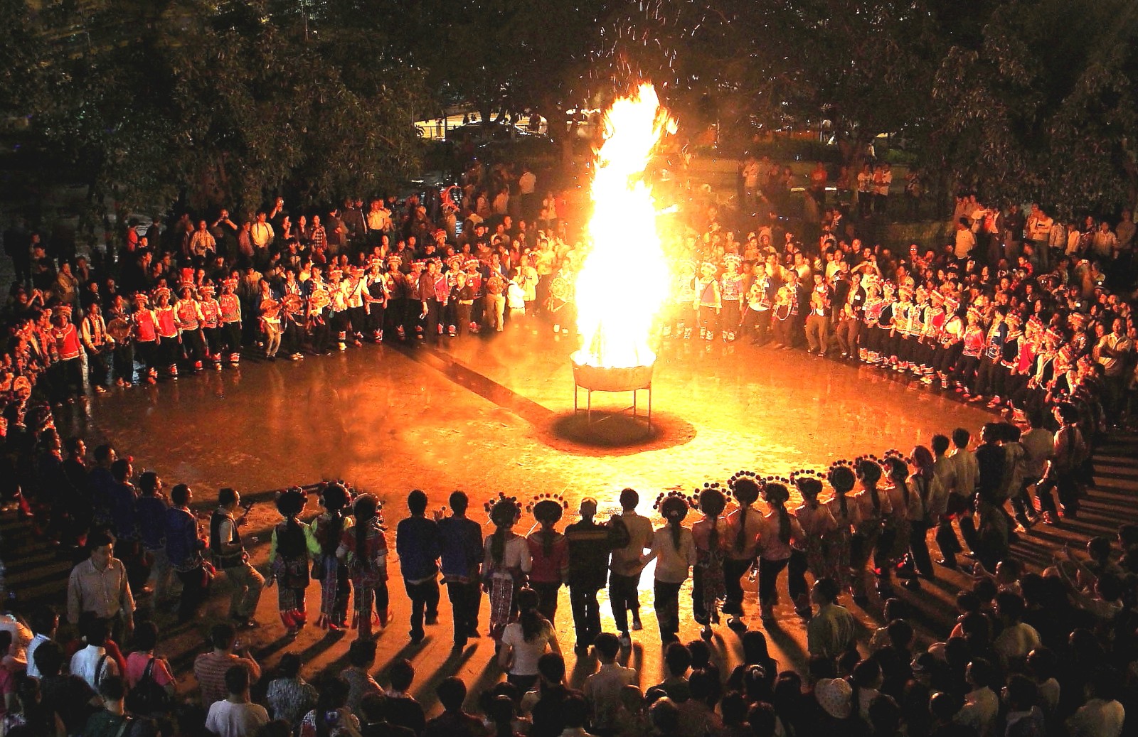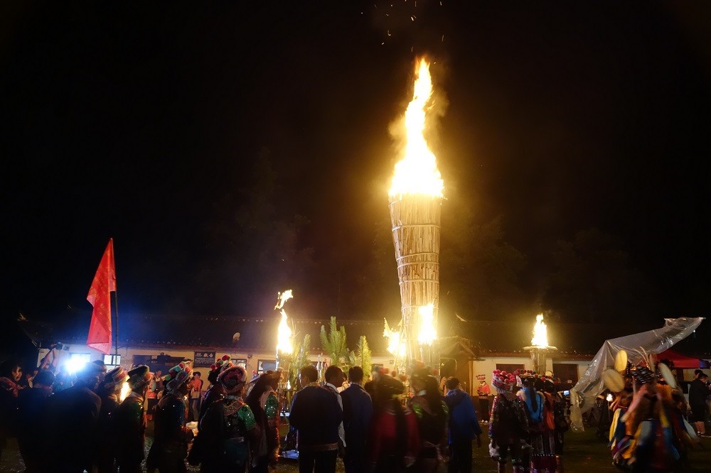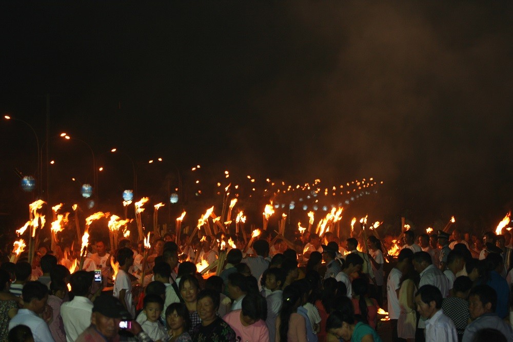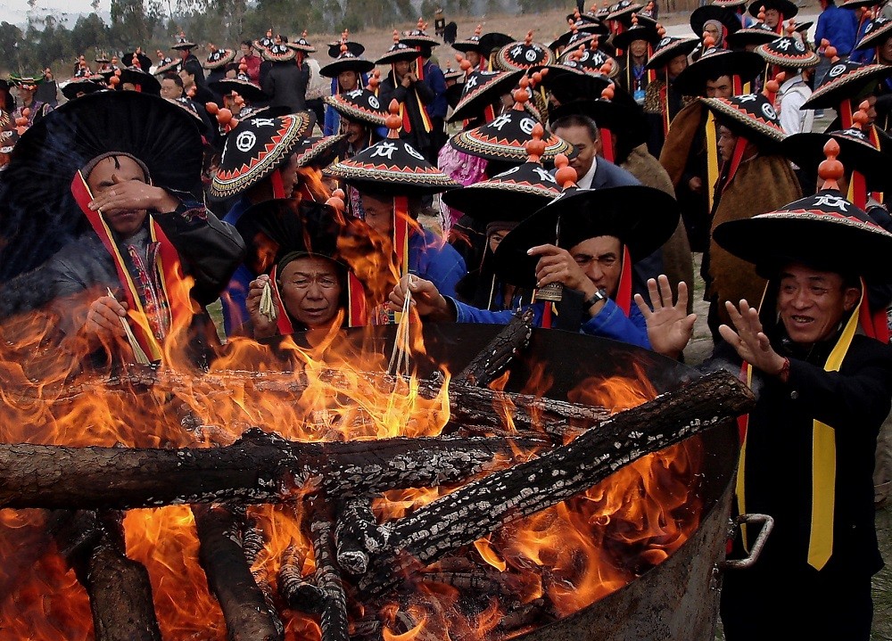 每年农历六月二十四日至二十七日的火把节是彝族传统中最为重要、最盛大的节日,彝族各村寨都要举行隆重的祭祀活动,祭天地、祭火、祭祖先、驱邪除恶,祈求六畜兴旺、五谷丰登、家宅平安,体现了彝族人民尊重自然规律、追求幸福生活的美好愿望。节日期间,探亲访友,听老人唱古歌,并举行盛大的对歌、跳脚、摔跤、磨担秋、斗牛等文艺体育活动,内容十分丰富。
