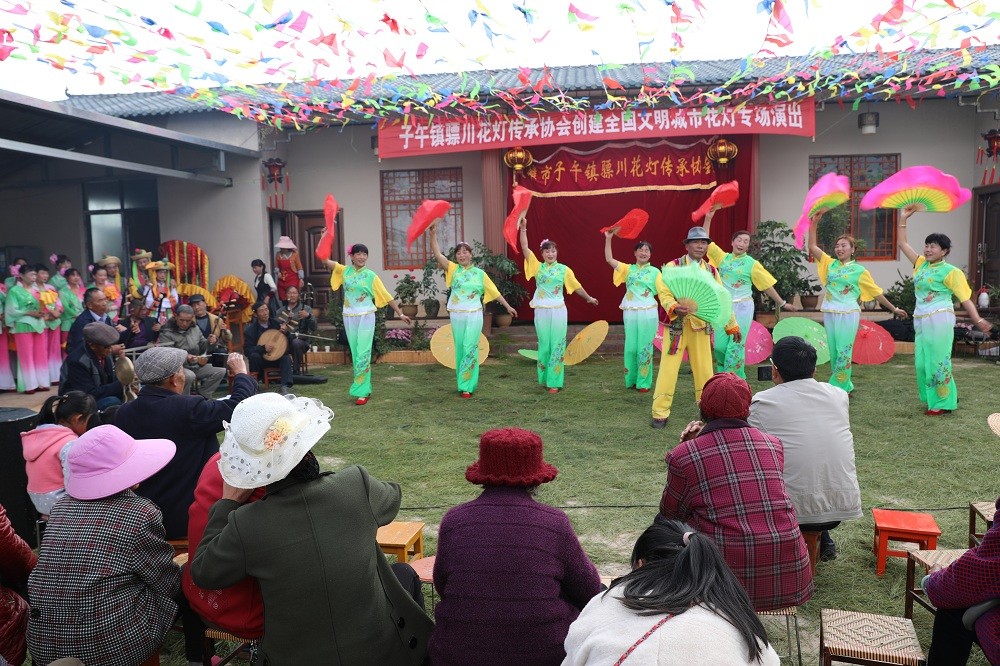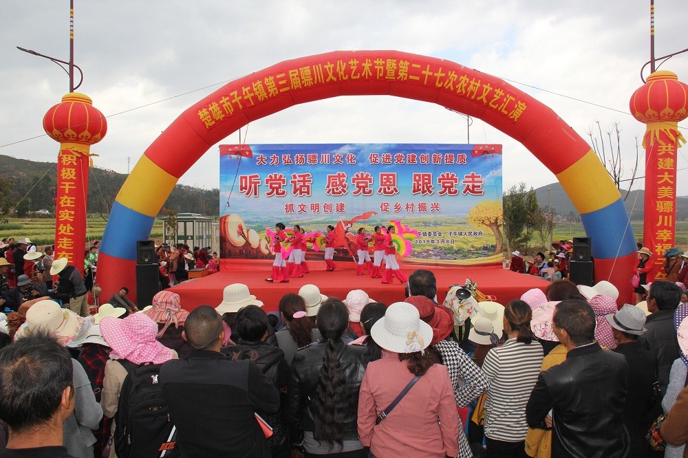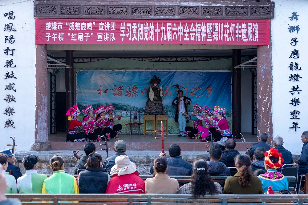 花灯,在楚雄市的子午、鹿城、东华、吕合等坝区乡镇广泛分布。距楚雄城区南25公里的子午镇、东华镇因“历史悠久,人口稠密,地势平缓、一马平川”,故得名“骠川”,有“花灯之乡”的美誉。明末清初,由于实行屯边制,大批移民和屯军将士来到楚雄一带,带来了民歌戏曲,与本土原住彝、白民族文化融合,催生了歌、舞、乐结合的楚雄花灯,构成了一种新的艺术形式,与元谋、姚安等地的花灯各具特点、内容多元。在当时的骠川一带,几乎村村有灯社、寨寨有戏台,户户有唱灯人。新中国建立后,随着党的文艺方针及戏剧改人、改戏、改制度政策的贯彻,在不断的艺术实践中,紧跟时代步伐,进入了真正繁荣发展的时期,现今还有70多支业余花灯团队活跃在民间和社区,仍然承担着丰富群众文化的重任。