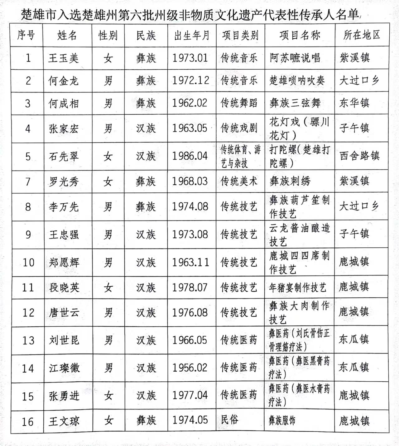 近日,楚雄彝族自治州人民政府命名了第六批州级非物质文化遗产代表性传承人共77人,楚雄市16人被列其中。